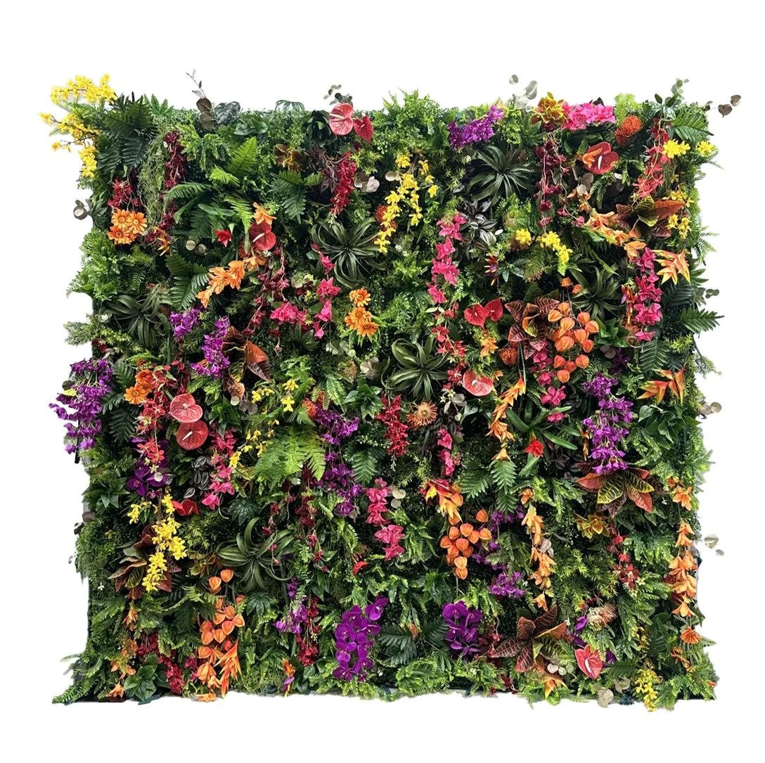 Bursting with bold blooms and lush greenery, this vibrant wall brings wild, artful energy to any celebration.