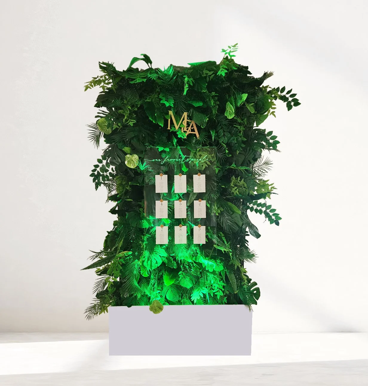 Your guests deserve a stunning welcome. Our customizable seating chart wall features lush tropical foliage, glowing uplighting, a gold monogram, and a sleek acrylic panel — available in table or alphabetical formats. Style it your way with any of our flower walls!